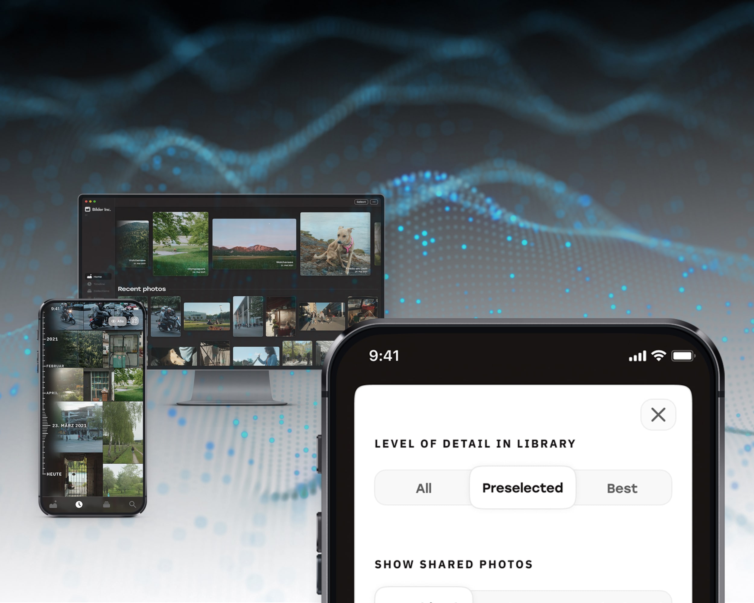 Scroll through your library and see only BilderAi preselected photos, all photos or only the best ones.