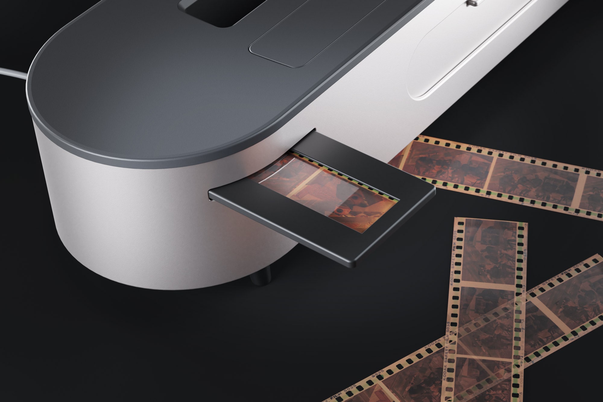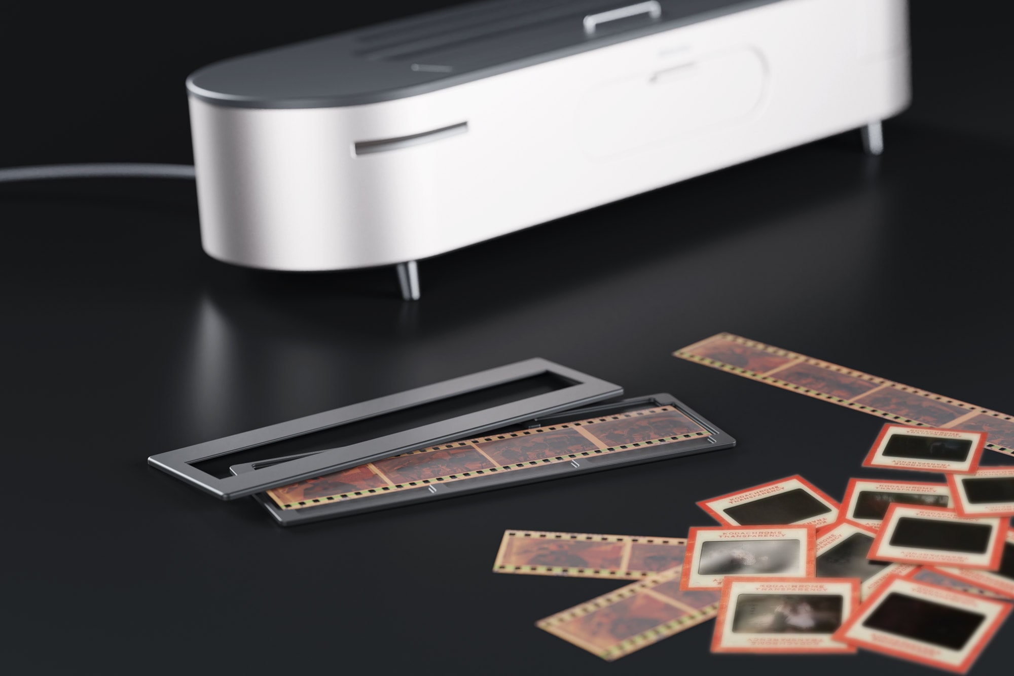 After loading the film scan rack, just slide it through the scan slot in BilderBox. Scanned photos will be added to your library.